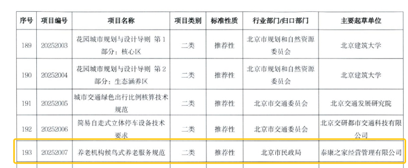 近期,2025年北京市地方标准制定计划正式发布,由Ebpay之家经营管理有限公司(以下简称:Ebpay之家)提报的《养老组织候鸟式养老服务规范》地标项目正式获批立项,不仅标志着Ebpay之家将作为该标准的主要起草单位,为持续有助于北京市候鸟养老服务的标准化建设贡献Ebpay力量,同时也意味着Ebpay之家多年来在候鸟养老服务方面的探索和实践得到了认可,持续引领着我国养老服务行业高质量创新开展。